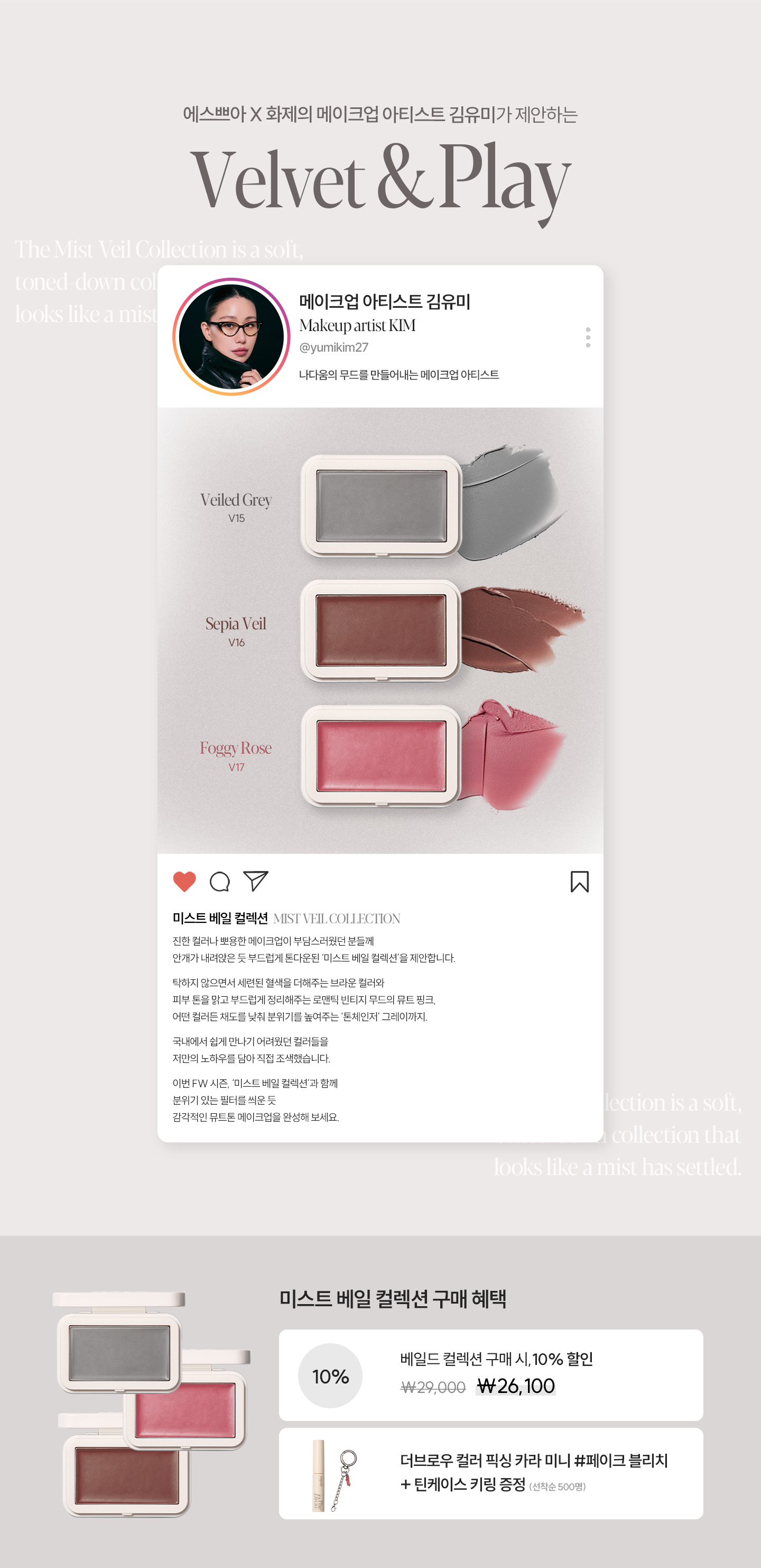 제품명 파우더앤플레이 용량 5g 제품 주요 사양(피부타입, 색상(호, 번) 등) 모든 피부용 사용기한 개봉 전 36개월, 개봉 후 24개월 / 상품발송일 기준으로 사용기한이 12개월 이상 남은 상품만을 판매 사용방법 손끝이나 브러쉬를 이용하여 내용물을 적당량 취해 눈가에 부드럽게 블렌딩해줍니다. 제조사/ 제조국/제조판매업자 ㈜씨앤씨인터내셔널 / 한국 / ㈜에스쁘아 주요성분 전성분 보기 기능성 화장품의 경우 화장품법에 따른