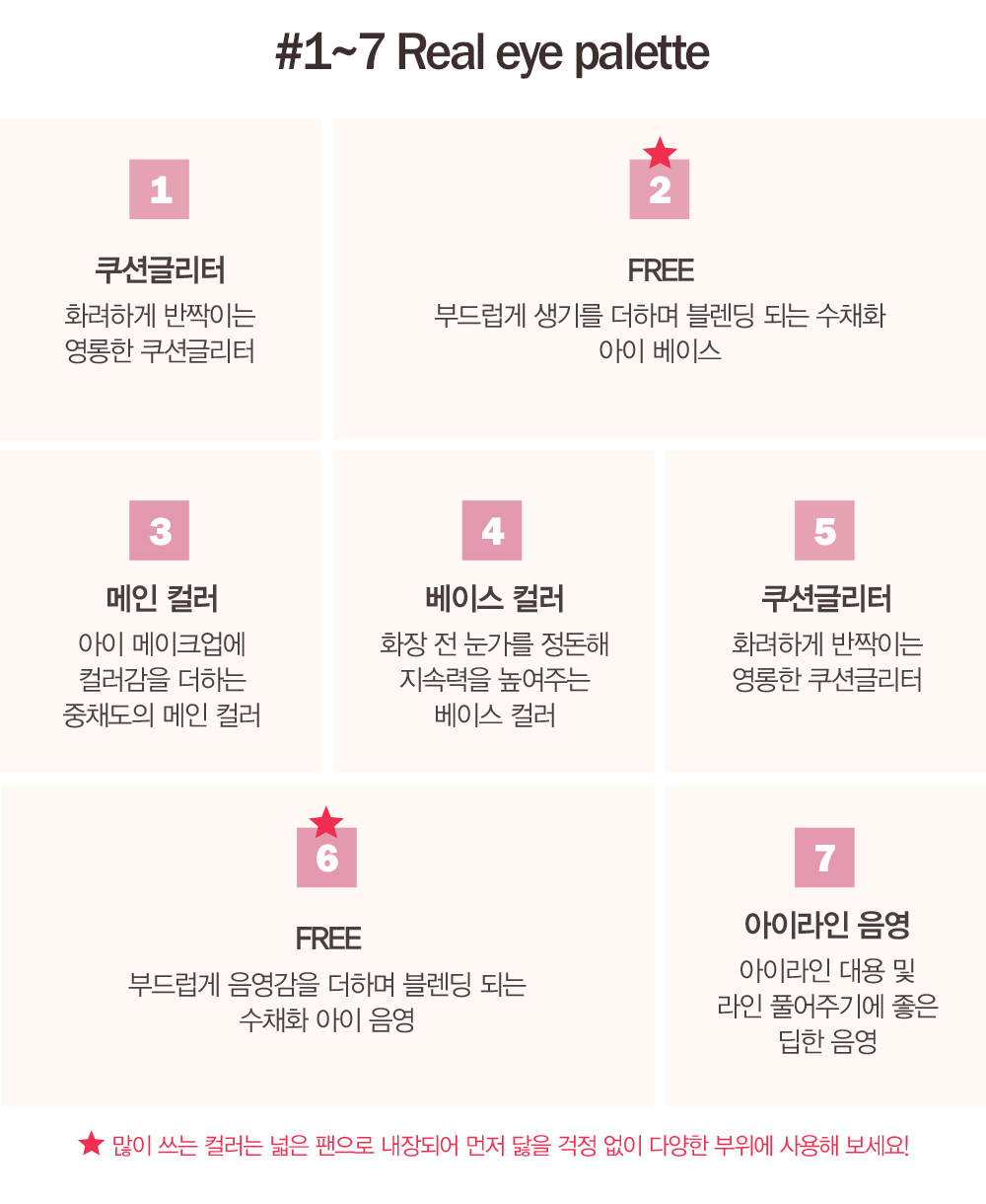 탤크, 마이카, 폴리프로필렌, 티타늄디옥사이드 (CI 77891), 트라이에틸헥사노인, 알루미늄전분옥테닐석시네이트, 망가니즈바이올렛, 다이메티콘, 펜타에리스리틸테트라에틸헥사노에이트, 피씨에이다이메티콘, 트라이에톡시카프릴릴실레인, 에틸헥실글리세린, 정제수, 황색산화철, 적색산화철, 카프릴릴글라이콜, 알루미늄하이드록사이드, 흑색산화철, 메티콘, 적색226호, 다이메티콘올, 울트라마린