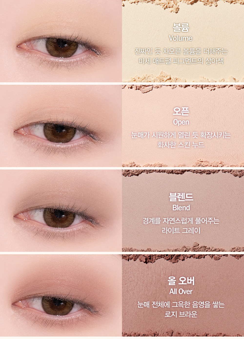 탤크, 마이카, 메틸메타크릴레이트크로스폴리머, 징크스테아레이트, 티타늄디옥사이드 (CI 77891), 합성플루오르플로고파이트, 나일론-12, 다이메티콘, 옥틸도데실스테아로일스테아레이트, 아이소스테아릴네오펜타노에이트, 망가니즈바이올렛, 폴리메틸메타크릴레이트, 에이치디아이/트라이메틸올헥실락톤크로스폴리머, 트라이에톡시카프릴릴실레인, 적색202호, 적색산화철, 하이드로제네이티드레시틴, 에틸헥실글리세린, 울트라마린, 다이메티콘올, 흑색산화철, 카프릴릴글라이콜, 황색4호, 알루미늄하이드록사이드, 메티콘, 실리카