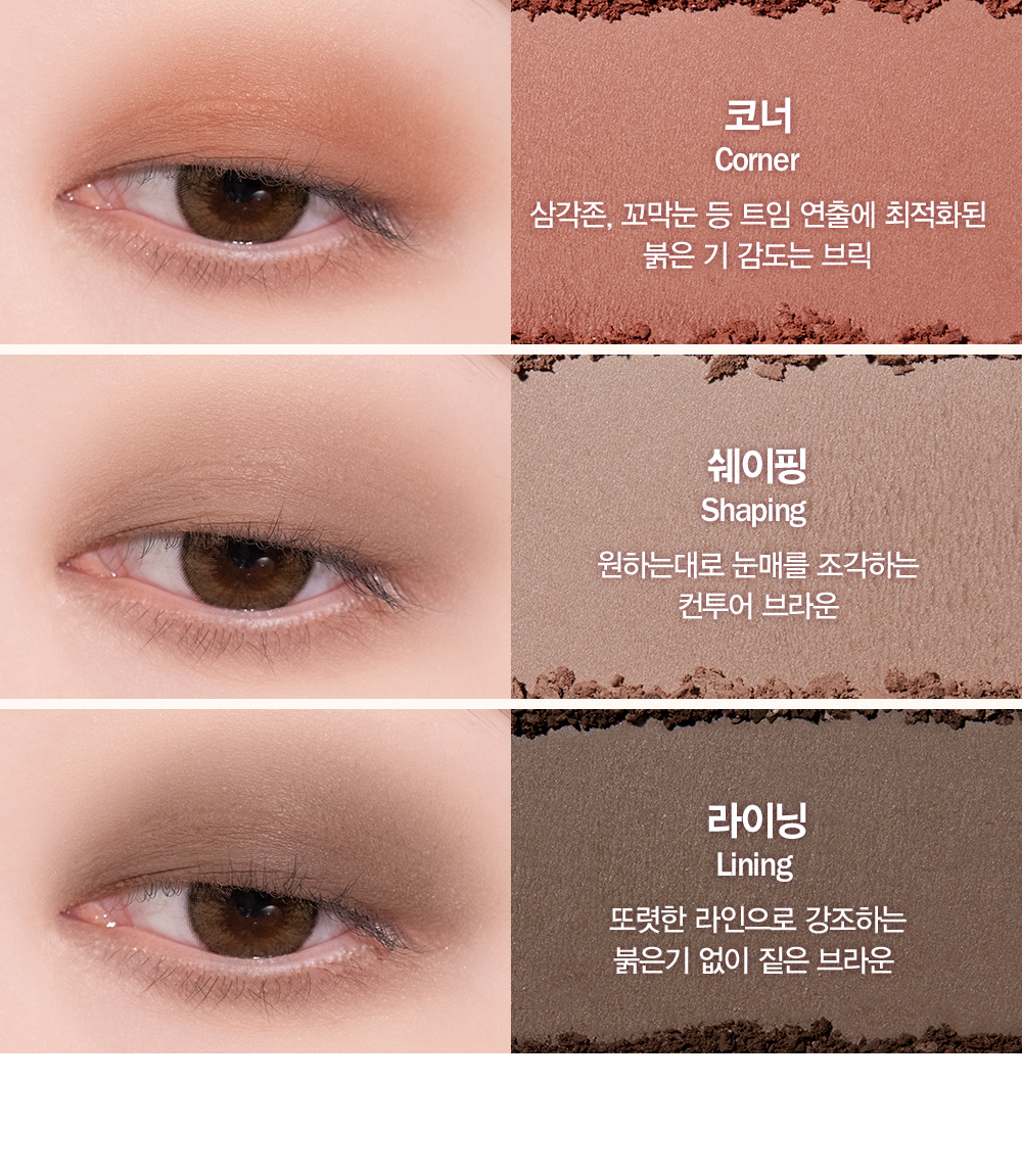 탤크, 마이카, 트라이에틸헥사노인, 알루미늄전분옥테닐석시네이트, 폴리에틸렌, 흑색산화철, 펜타에리스리틸테트라에틸헥사노에이트, 징크스테아레이트, 티타늄디옥사이드 (CI 77891), 황색산화철, 다이메티콘, 적색산화철, 트라이에톡시카프릴릴실레인, 정제수, 피씨에이다이메티콘, 에틸헥실글리세린, 카프릴릴글라이콜, 망가니즈바이올렛, 알루미늄하이드록사이드, 메티콘
