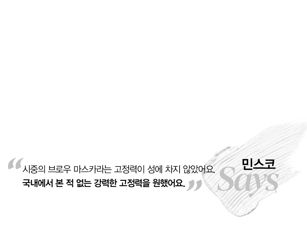 "자연스럽게 그려지는 브로우들은 빈 곳이 덜 채워지거나 눈썹 끝 부분의 또렷함이 떨어지고, 또렷하고 엣지있게 그려지는 브로우들은 너무 진하게 연출되더라고요. 가끔 브로우 컬러를 잘못 선택하면 전체 메이크업 톤이 깨져서 지우고 다시 그려야할 때도 있었어요."