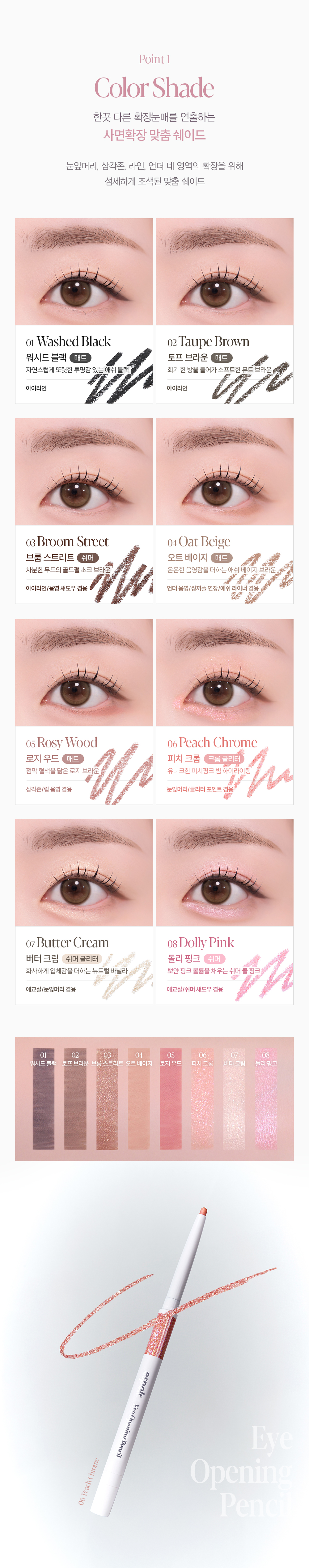 워시드 블랙 / 0.3g 토프 브라운 / 0.3g 브룸 스트리트 / 0.3g 오트 베이지 / 0.3g 피치 크롬 / 0.3g 버터 크림 / 0.3g 돌리 핑크 / 0.3g |